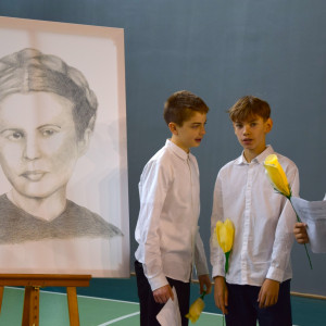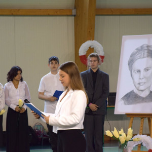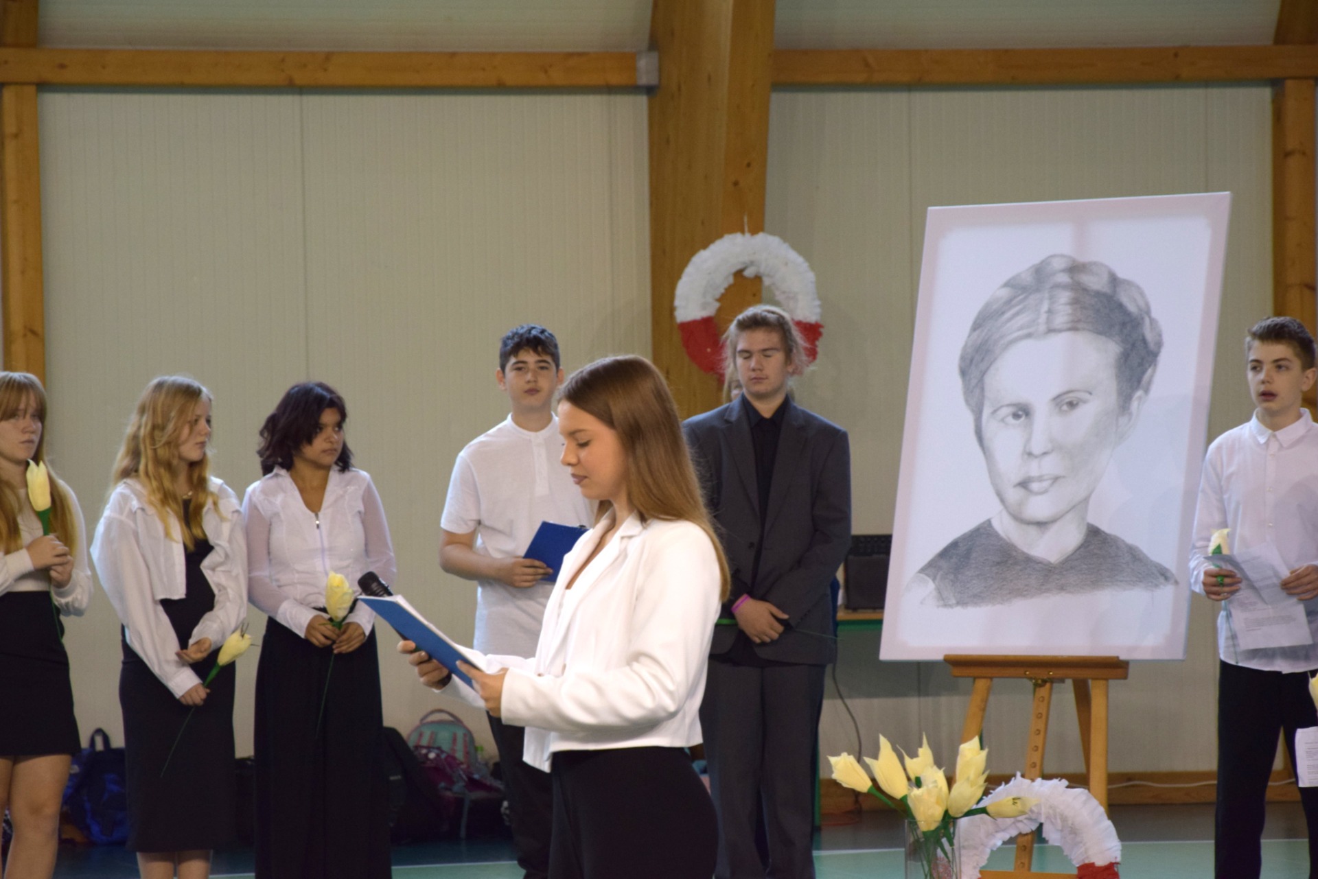 Na apelu zaprezentowany został portret Ireny Sendlerowej wykonany przez byłą uczennicę naszej szkoły, który teraz w postaci wielkoformatowego obrazu będzie nam teraz towarzyszył podczas szkolnych uroczystości.