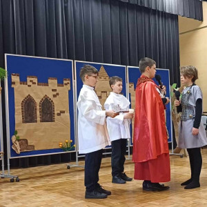 Wzruszające pieśni, pięknie recytowane wiersze, niesamowita gra aktorska i przede wszystkim żywa lekcja historii - to zostanie nam w pamięci po dzisiejszym apelu z okazji Święta Chrztu Polski i Święta Konstytucji 3 Maja. Przedstawienie przygotowali uczniowie klas 4, a o oprawę muzyczną zadbali uczniowie szkolnego zespołu muzycznego. Opiekunami artystycznymi wydarzenia były Panie: Ewa Bierska, Barbara Bielawska, Anna Dukiewicz i Justyna Kochańska-Tuła. Występom towarzyszyły wystawy tematyczne, kóre podziewiać można w holu szkoły i w GCK.