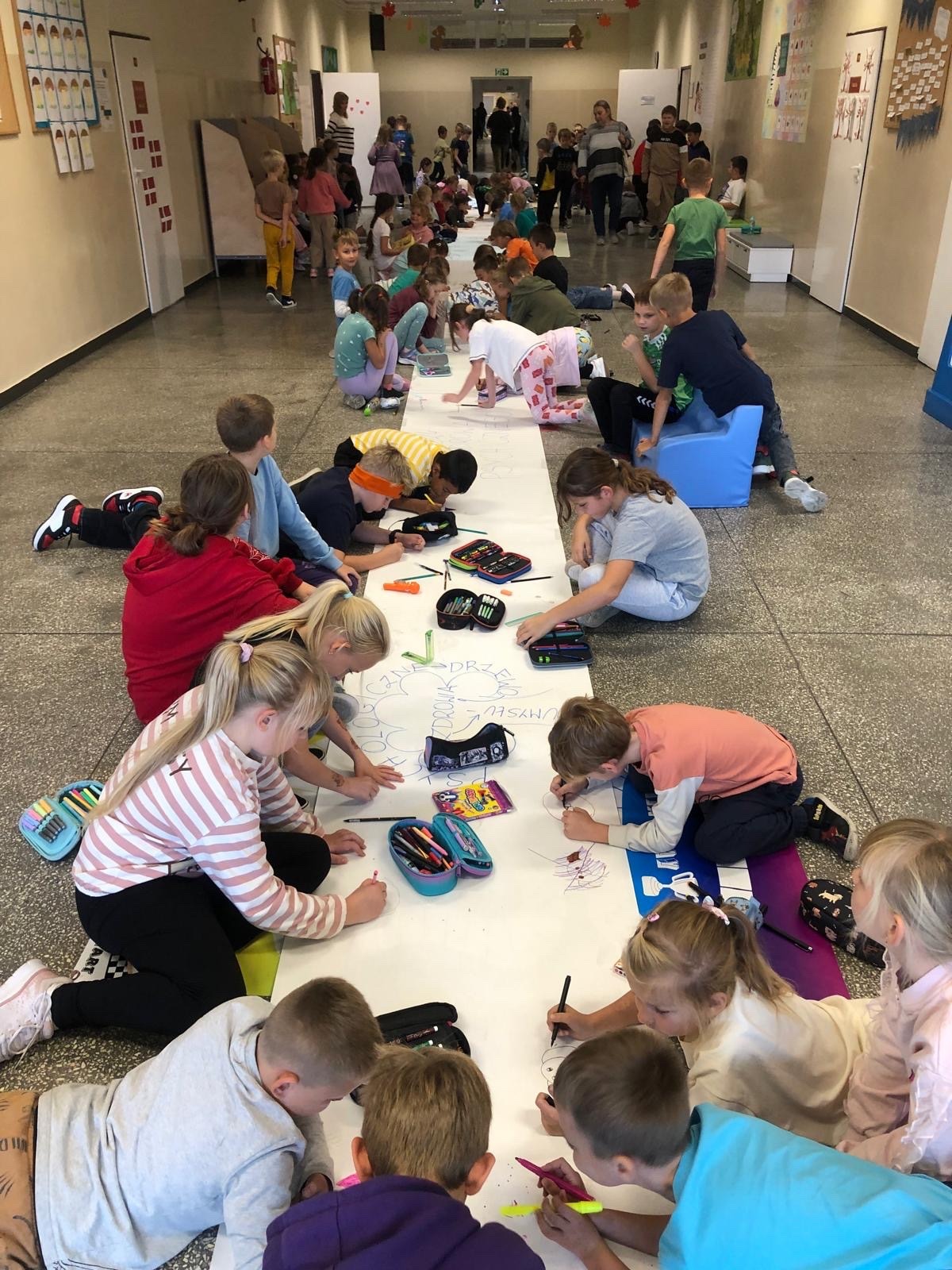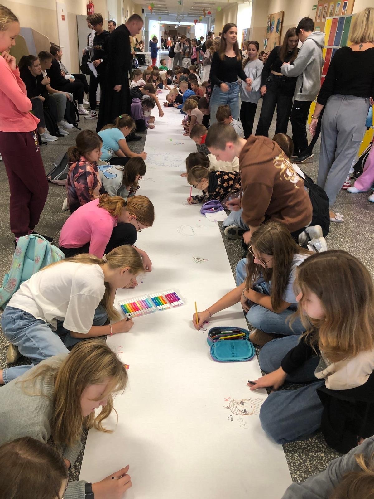 W dniu 10.10.2024 w naszej szkole zorganizowaliśmy wyjątkowy Dzień Zdrowia Psychicznego, który miał na celu zwrócenie uwagi na znaczenie zdrowia psychicznego u dzieci i młodzieży. W ramach tej inicjatywy, uczniowie mieli okazję wziąć udział w kreatywnej i terapeutycznej aktywności - malowaniu dywanu z papieru, który ozdobił nasz szkolny korytarz.