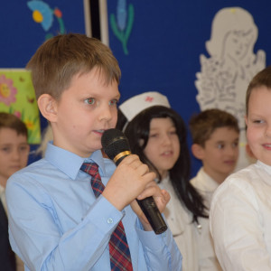 Chłopcy z klasy 2a i 2b przygotowali wiersze, piosenki i tańce, które zaprezentowali podczas długiej przerwy. Wszystkie Panie, które zgromadziły się w auli szkolnej, otrzymały laurki zrobione przez uczniów podczas zajęć świetlicowych i mogły poczęstować się ciastkiem ufundowanym przez Panów.