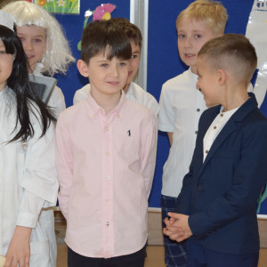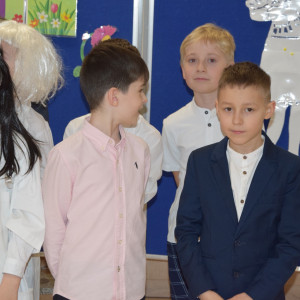 O przygotowanie uroczystości zadbały wychowawczynie 2a i 2b: Pani Hanna Bielaszewska i Pani Dobrosława Sołtys, a tablicę z życzeniami wykonali uczniowie świetlicy z Panią Małgorzatą Kozłowską.