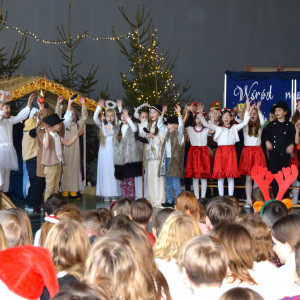 Uczniowie klasy 2c i 3d wraz z wychowawczyniami Panią Joanną Misiuną i Justyną Kochańską - Tułą przygotowali dla całej szkoły przedstawienie jasełkowe, podczas którego prezentowali wiersze i pastorałki. Sześciolatki razem z p. Kingą Furgał przygotowali świąteczny układ choreograficzny.