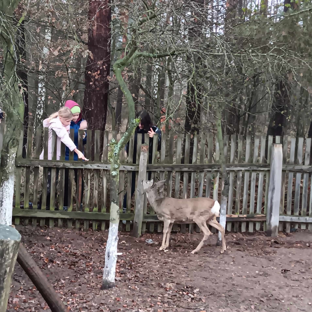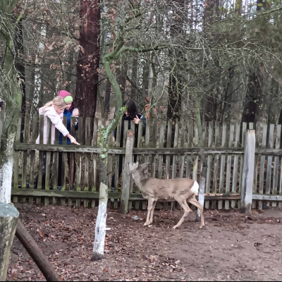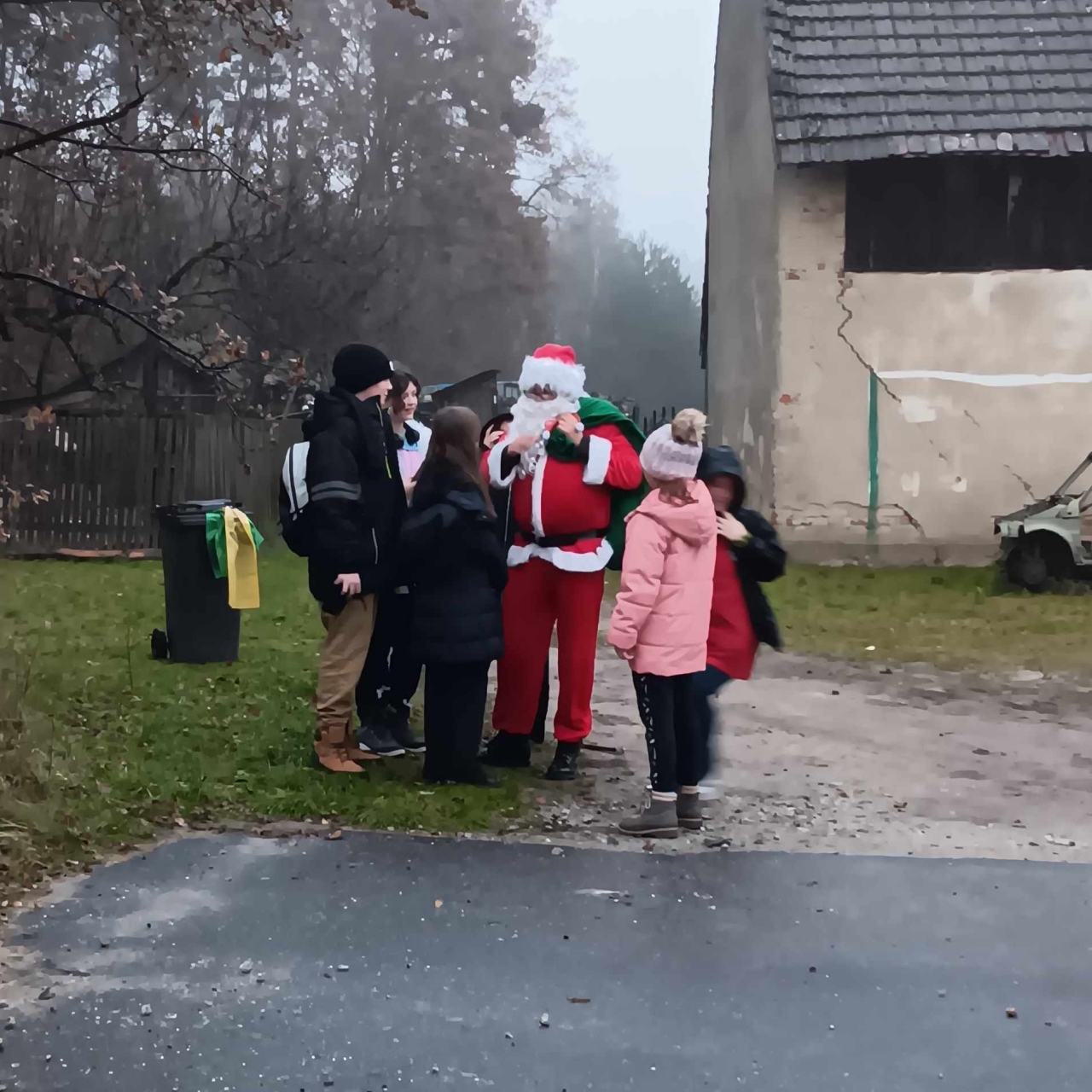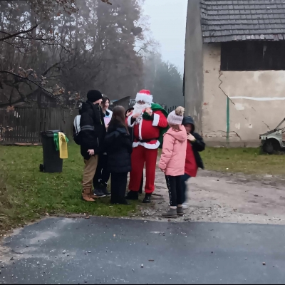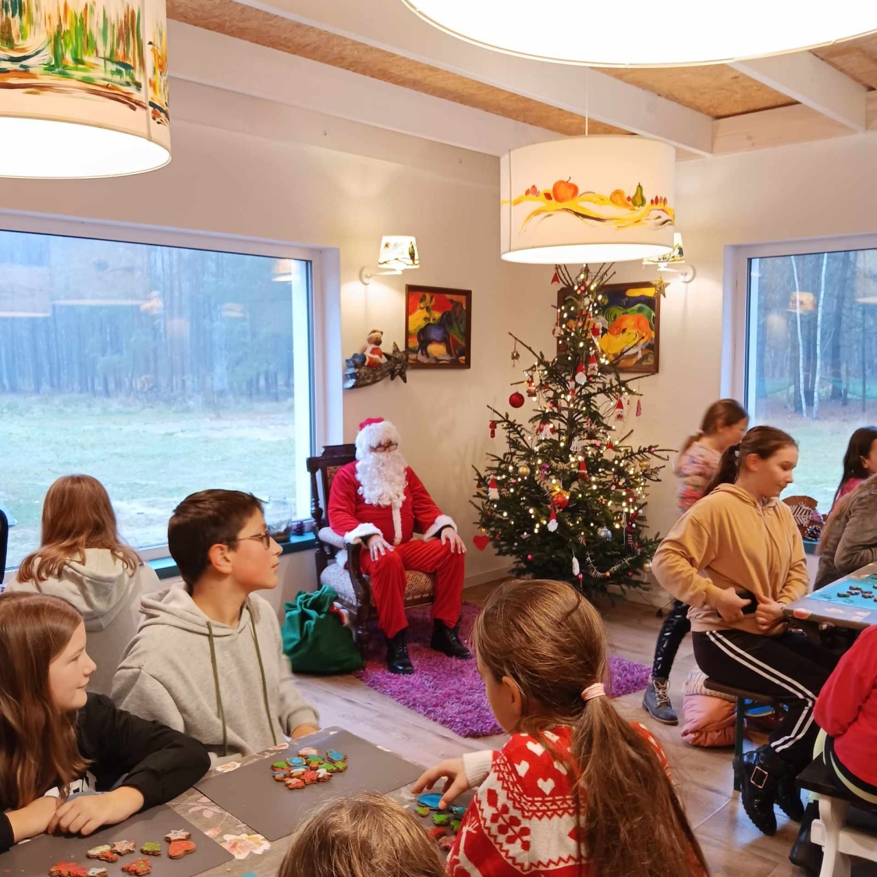 W trakcie ozdabiania łakoci kolorowym lukrem przez ogromne okno dojrzeliśmy postać w czerwonym stroju przemykającą wśród drzew rozciągającego się nieopodal lasu.Zarzuciwszy na siebie kurtki, ruszyliśmy na poszukiwanie uciekiniera, którym okazał się Mikołaj. Gdy udało się nam go dogonić, wspólnie nakarmiliśmy Marzenkę, sarenkę o niepohamowanym apetycie na marchew, kapustę i suszone pieczywo.