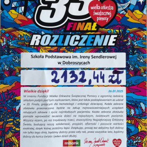 Nasza szkoła wzięła udział w 33. Finale Wielkiej Orkiestry Świątecznej Pomocy i udało nam się zebrać kwotę 2132,44 zł! To wspaniały wynik, który zawdzięczamy ogromnemu zaangażowaniu uczniów, nauczycieli i rodziców. Dzięki wspólnemu wysiłkowi mogliśmy wesprzeć szczytny cel, jakim jest zakup sprzętu medycznego dla dzieci. Dziękujemy wszystkim, którzy wzięli udział w tej akcji i pomogli, by nasza zbiórka była tak udana! Akcję korodynowało Szkolne Koło Wolontariatu PoMOCNI i Pani Joanna Piotrowska.