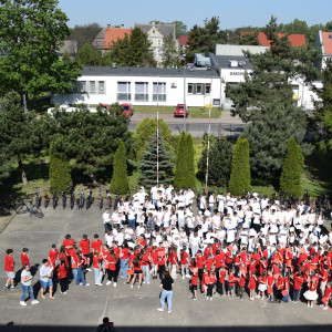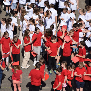 W ostatnim dniu nauki przed majówką z inicjatywy Samorządu uczniowskiego utworzyliśmy przed szkołą "żywą flagę".