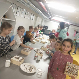 Po zajęciach każdy z uczestników wiedział, co powinien mieć i znać prawdziwy poszukiwacz minerałów. Na zakonczenie zajęć dzieci wykonały dwie prace: drewnianą szkatułkę ozdobioną prawdziwymi drobnymi minerałami oraz amulet szczęścia – wisior z minerałami.