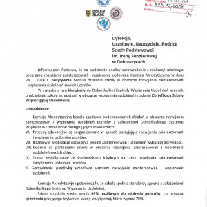 Jako placówka pozytywnie przeszliśmy przez proces akredytacji i zastaliśmy zakwalifikowani do Sieci Szkół Wspierających Uzdolnienia i Zainteresowania Uczniów. Zdobylismy 95 proc. możliwych do zdobycia punktów.